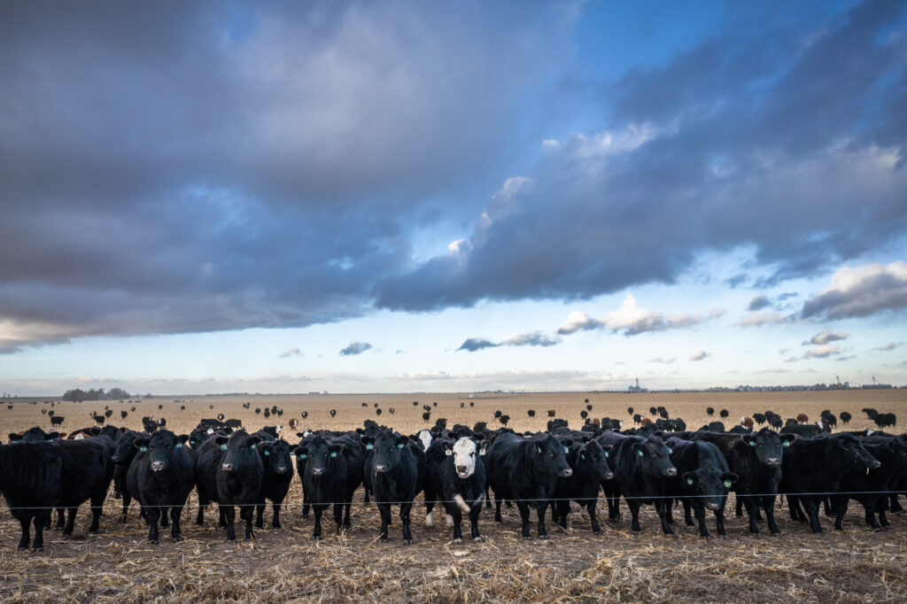 Hart Van Denburg/CPR NewsPart of the Weathers Farms cattle herd of 400 or so Black Baldies — a cross between Hereford and Angus beef cattle. The family runs about 3,000 acres in Yuma County, with an equal amount of native grass. The white-face cow in the center is one Ty Weathers, who was 13 at the time, bought at the National Western Stock Show in 2024. It’s a different breed, a Maintainer.