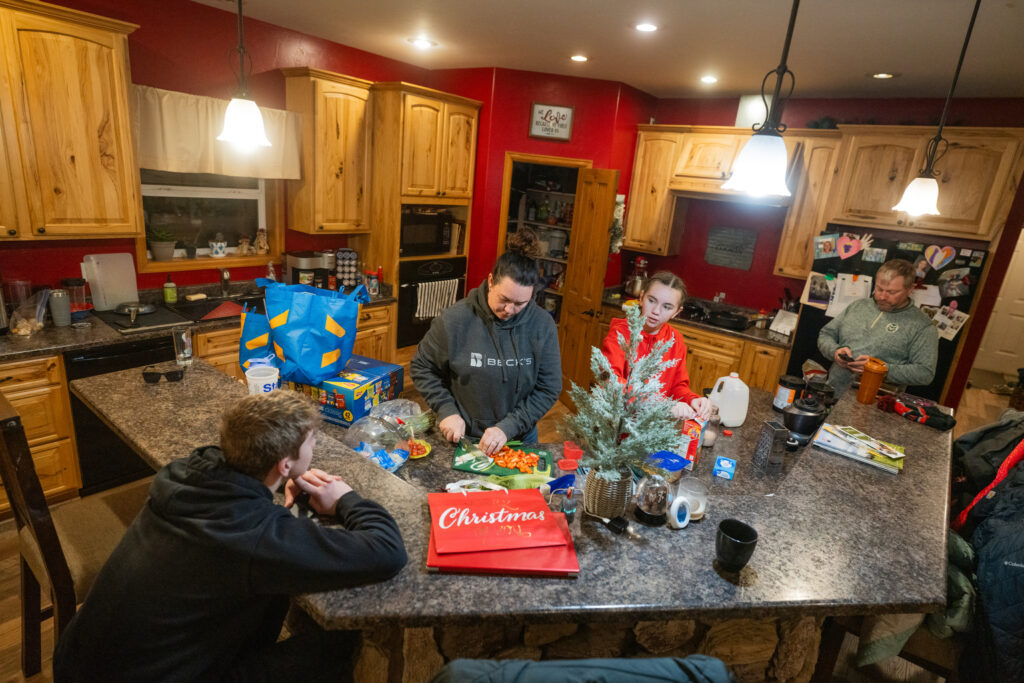 Hart Van Denburg/CPR NewsIn their kitchen on the evening of Jan. 22, Nikki Weathers preps food for the family’s two-night stay in Denver. Ty, left, periodically checks the Stock Show livestream on his phone. Tenley, 12, in a red sweatshirt, helps Nikki while Nate, right, is ready to put tacos on the table for dinner — made with beef from the family herd. Ty’s mom will take him to basketball practice in Yuma after dinner.