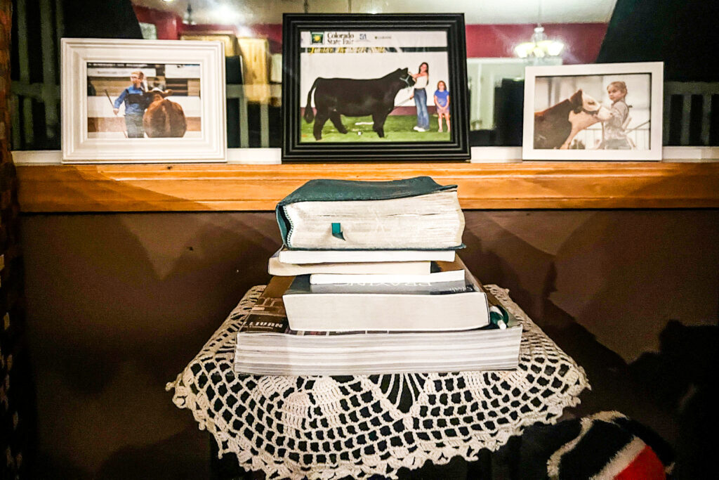 Hart Van Denburg/CPR NewsThe Weathers family Bible sits on a table below snapshots of the kids at different shows, in the family’s living room.