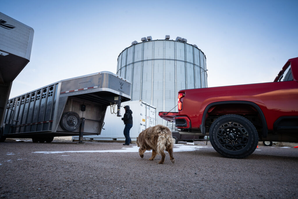 Hart Van Denburg/CPR NewsAs her dog Louie shuffles over to take a look, Nikki Weathers gets ready to hook the stock trailer to Nate Weathers’ pickup truck on Wednesday evening, Jan. 22, at the family farm in Yuma County. The Weathers pack the trailer the night before the National Western Stock Show, then put two yearlings in the trailer early the following morning.