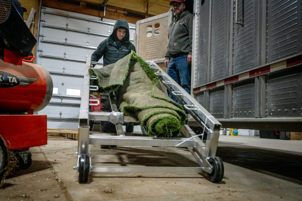 Hart Van Denburg/CPR NewsAs his dad watches, Ty Weathers wheels a folding platform and a plastic grass mat into the trailer. The yearling cattle will stand on the platform, while tethered, as they’re prepped for the show.