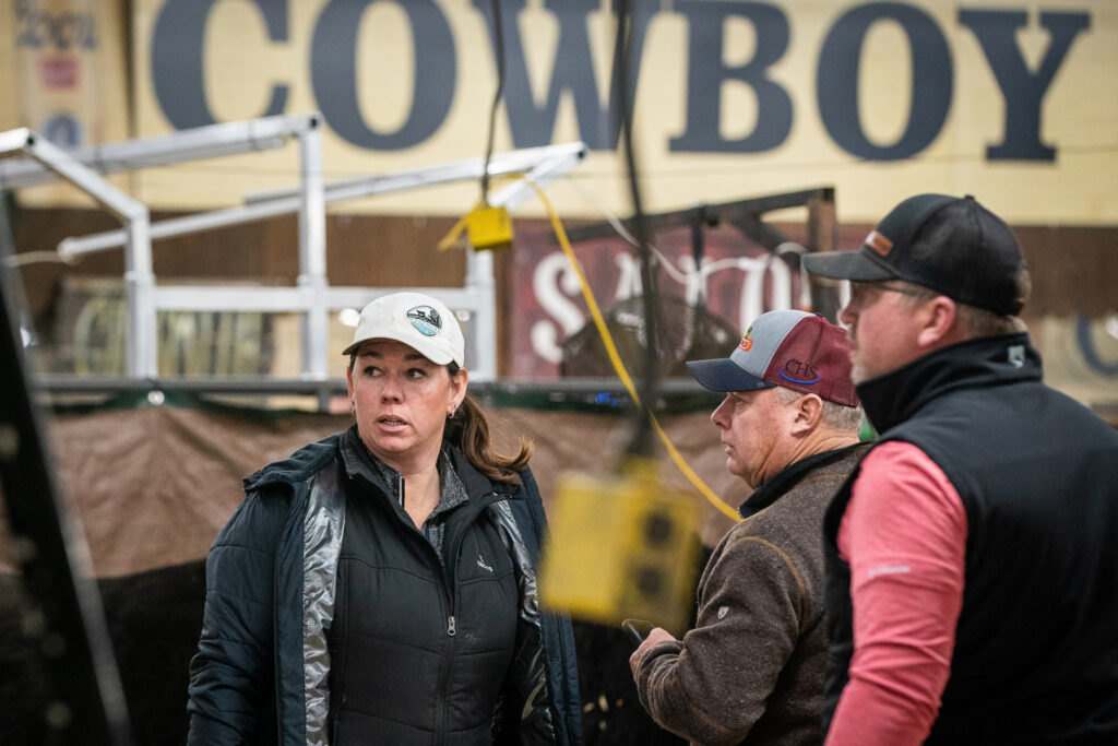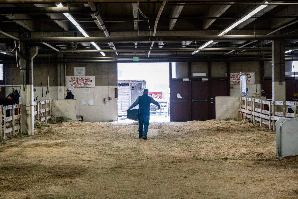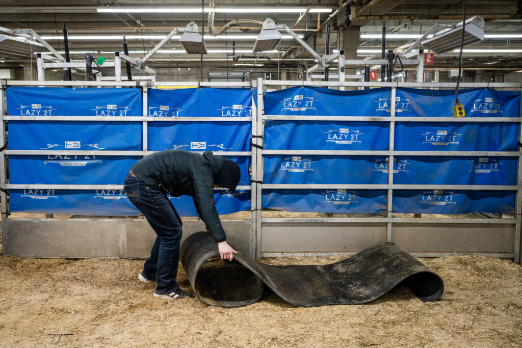 Hart Van Denburg/CPR NewsFrom the moment they back the trailer up to the barn door in Denver, the family is in motion, getting unpacked and getting the yearlings washed, dried and weighed in. Ty Weathers unrolls a rubber mat in their designated stall at the National Western Stock Show on Jan. 23. The family’s brand is printed on the tarp in the background.