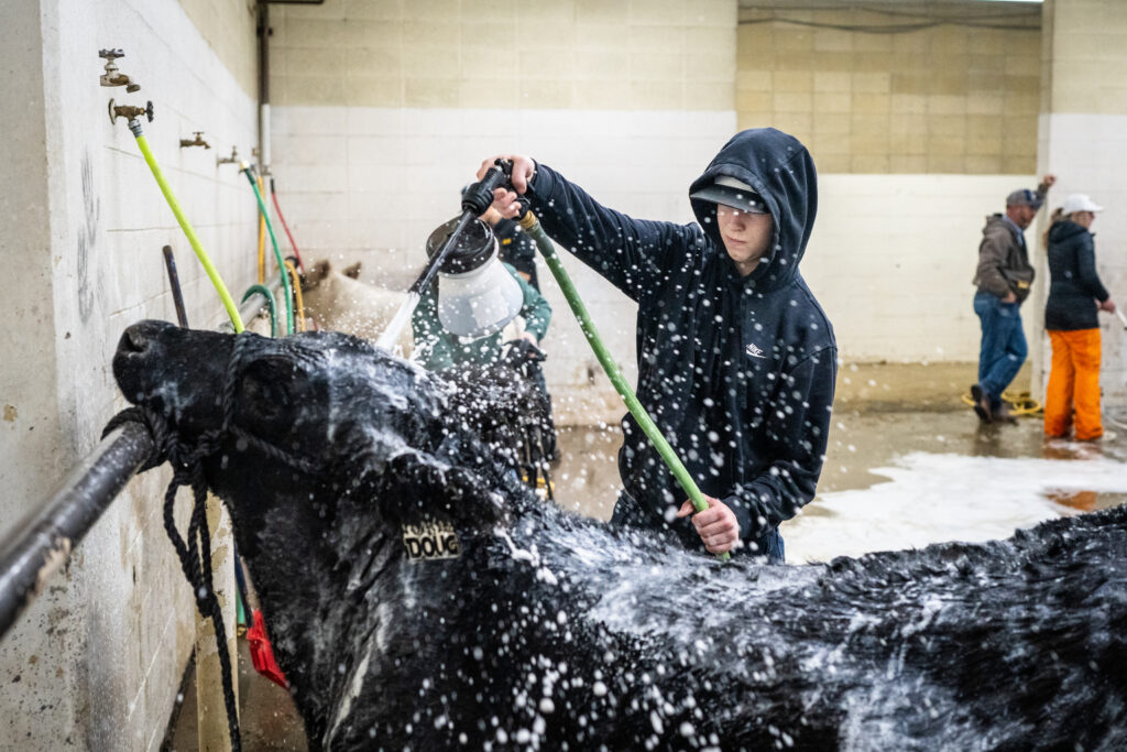 Hart Van Denburg/CPR NewsWhile his parents and sister continue to unpack and get settled at the Stock Show, Ty takes his steer Doug for a wash.