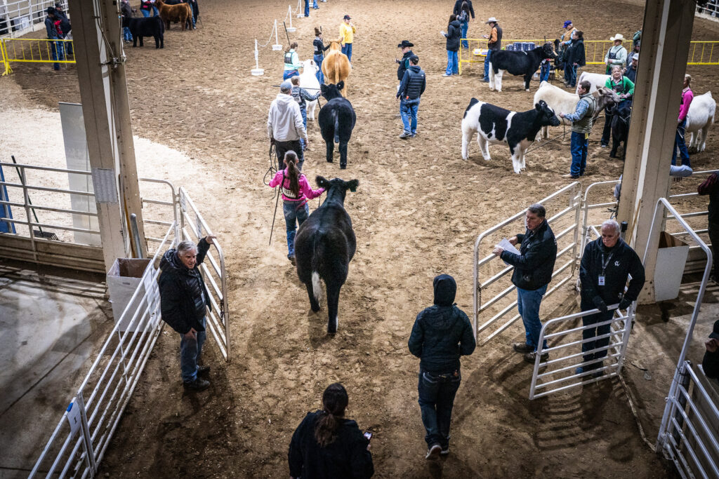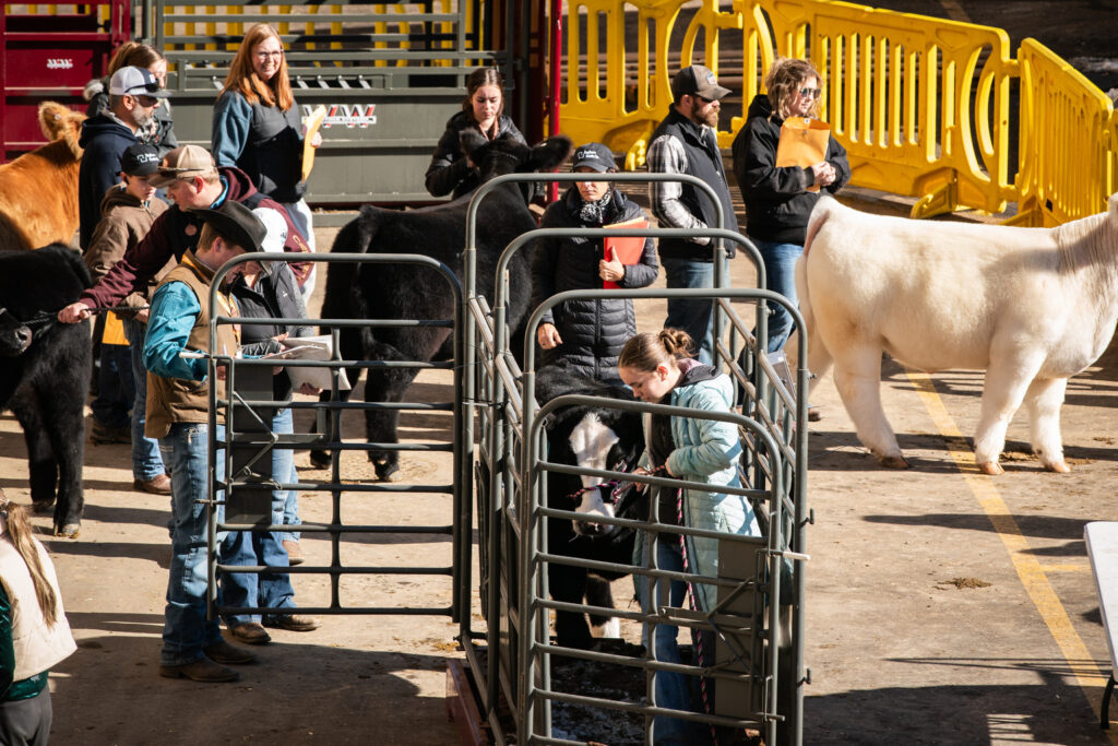 Hart Van Denburg/CPR NewsAfter the yearlings are washed and dried, they’re taken to the weigh-in. Here, Tenley Weathers, 12, in the turquoise coat, leads her heifer Francis onto to scales on Jan. 23. Francis weighed in at 880 pounds, putting her in a class with nine others from across the western United States. Ty’s steer Doug weighed 835 pounds, in a class of 13.