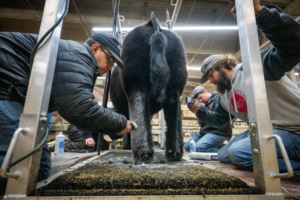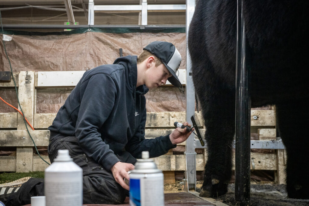 Hart Van Denburg/CPR NewsNate Weathers watches as Levi Zwirn dresses the yearling steer’s tail top so that it sits up and can be clipped evenly with scissors. All manner of products are used on the show cattle’s coat and hide in an effort to better show the animal’s natural posture, structure, size, balance and more. As soon as they are brought back from the show ring, it’s all cleaned off.