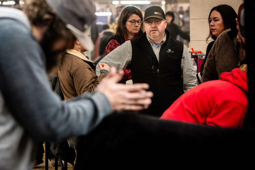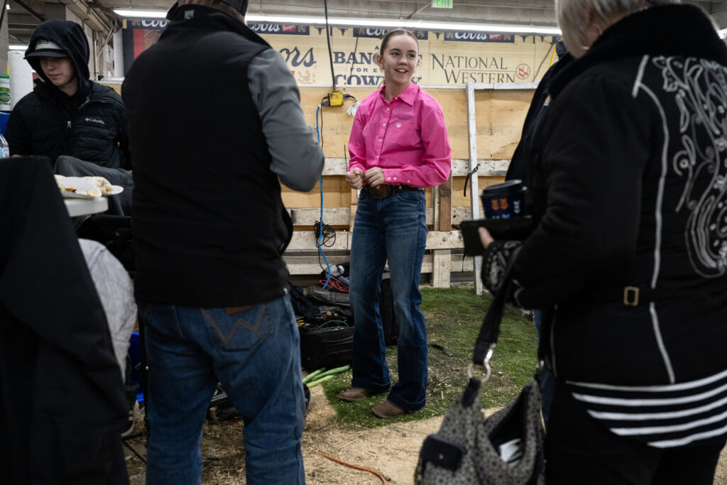 Hart Van Denburg/CPR NewsAfter a second night in a local hotel, the Weathers family returns for another early morning at the Stock Show, Saturday, Jan. 24. Now it’s 12-year-old Tenley’s turn to prep her heifer Francis. This morning, her grandparents Byron and LaLani, backs to the camera, came from Fort Morgan to support their grandchildren.