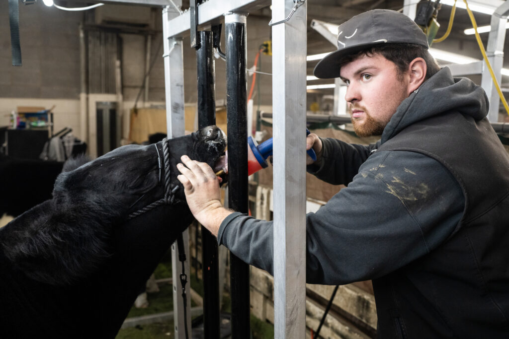 Hart Van Denburg/CPR NewsShow cattle must be tied up closely for a while to hold them still as they’re prepped for show — no water breaks. Instead, family friend and neighbor TJ Rice frequently squirts hydration liquid into Doug’s mouth.
