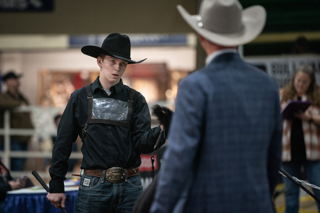 Hart Van Denburg/CPR NewsTy Weathers watches the judge as he looks over Doug the steer, Jan. 24, 2024 at the Events Center ring at the National Western Stock Show. It's over in just a few brief moments. Doug placed 3rd in his weight class, competing against yearlings from all over the West.