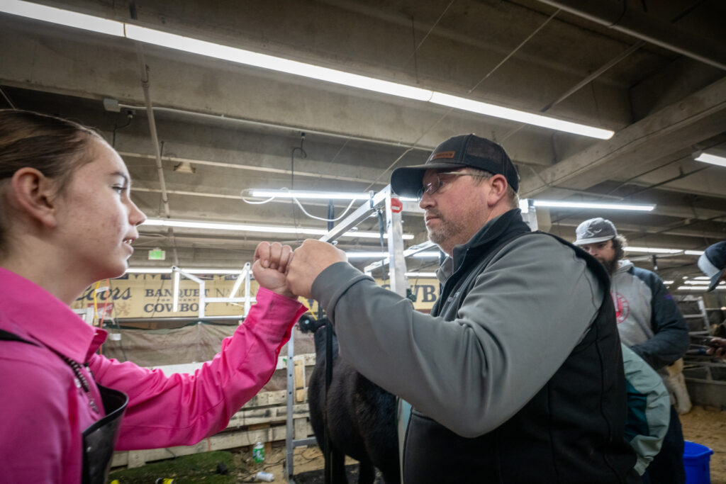 Hart Van Denburg/CPR NewsTenley gets a fist bump from her dad Nate back at the weathers stall. Her heifer Francis took fourth place in a class of nine competitors from across the West.