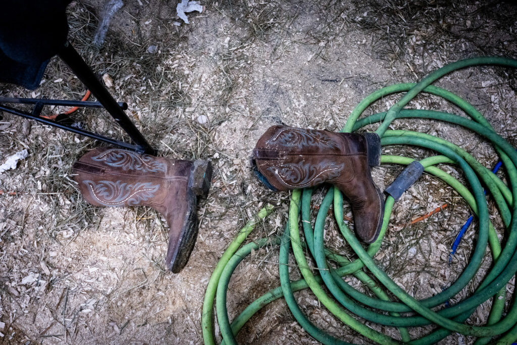 Hart Van Denburg/CPR NewsTenley Weathers’ boots sit in the dust back at the stall after she changed back into everyday wear to help clean things up, pack the trailer and head back to Yuma.