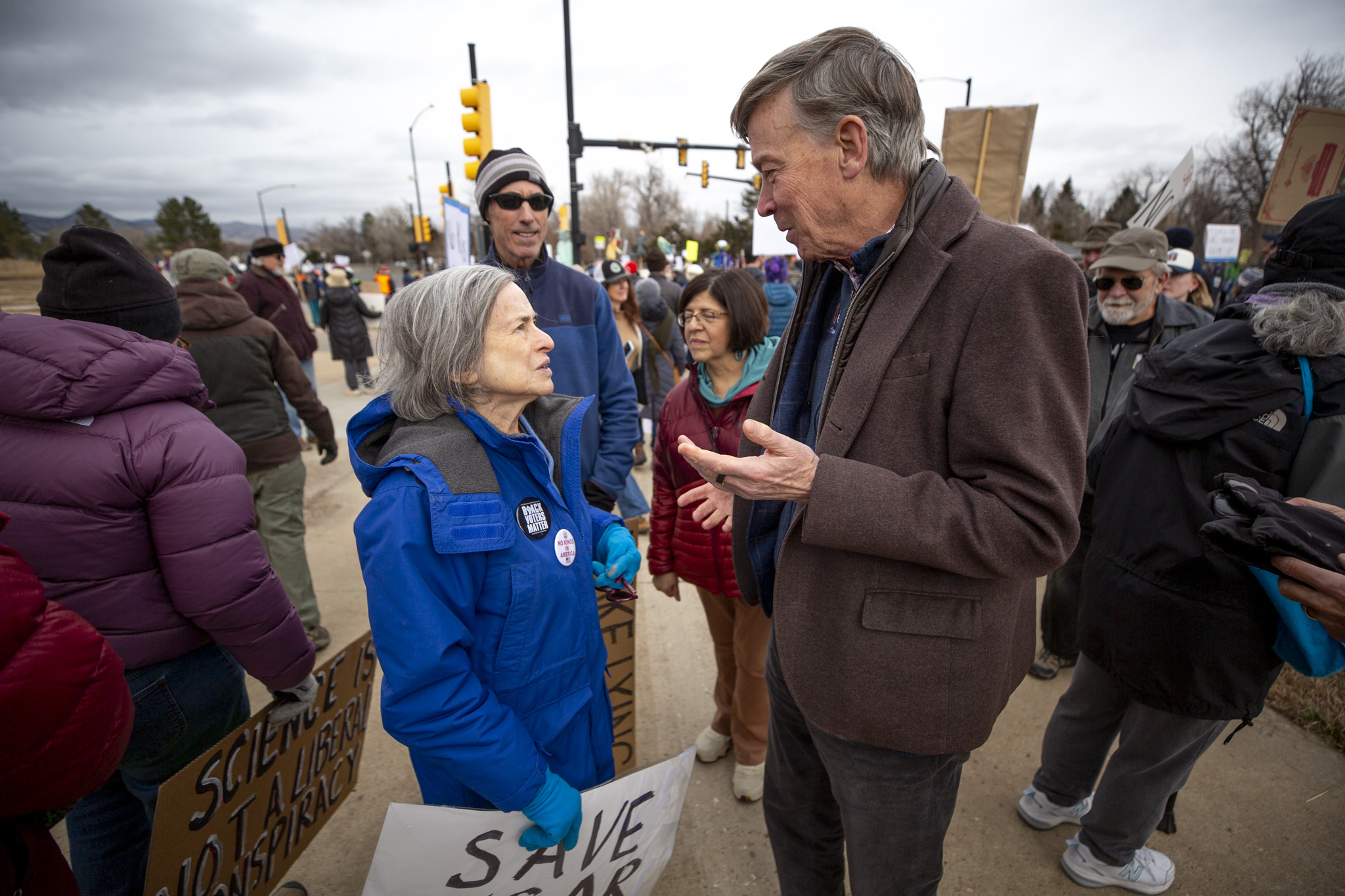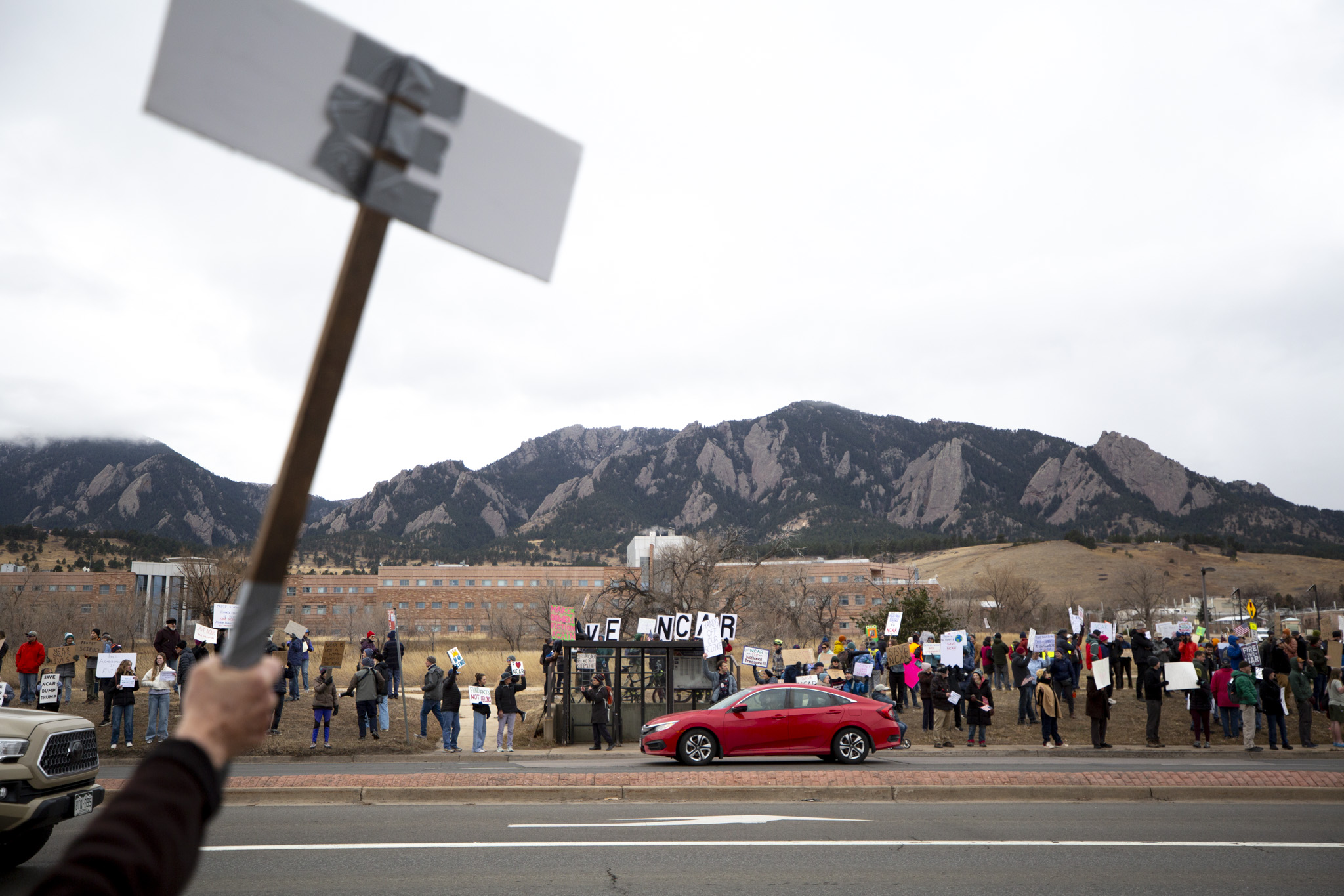 Snow lightly fell on protesters Saturday, who waved signs saying “Save NCAR” and solicited more than a few supportive honks from drivers.